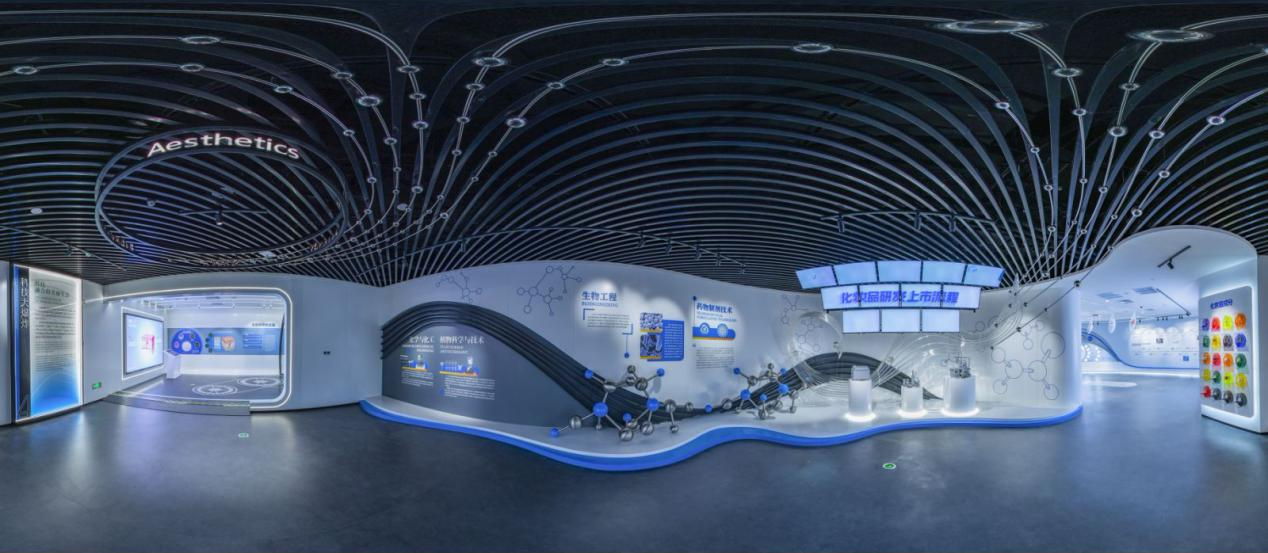 展館設計中重點進行科技展項的呈現,以生命科學的發展為切入,揭示多學科、多組學對化妝品科技發展的推動作用。尤其進入20世紀,世界美妝科技日新月異,邁向醫美抗衰新階段。